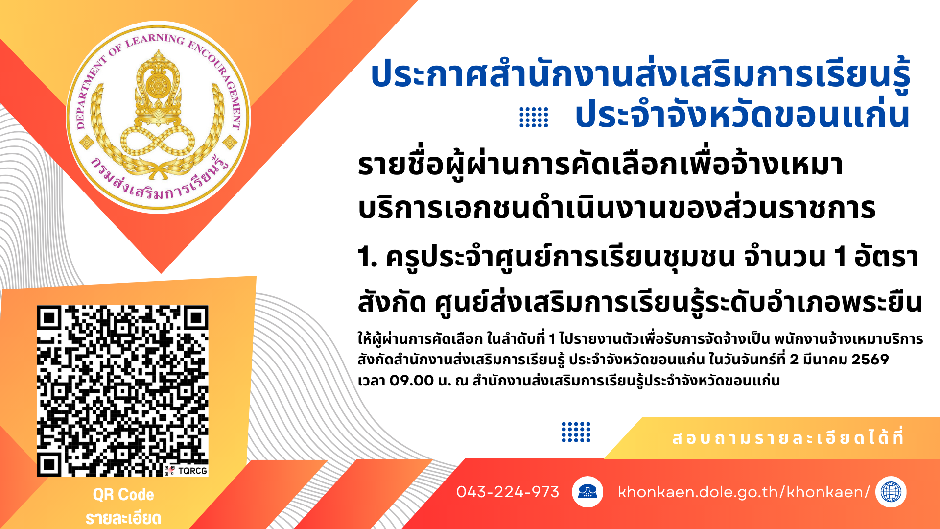 ประกาศจาก สำนักงาน สกร.ประจำจังหวัดขอนแก่น
